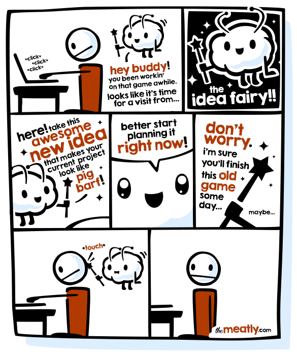 Jenze pak dojde na tvorbu samotne hry a hratelnosti, coz vubec neni dobre definovany problem a dopredu neni jasne, co by melo vzniknout a jestli se to bude dobre hrat. Napred to vypada dobre, vznikaji skicy hlavnich postav, kostra pribehu, prvni modely, animace a tak dal... Ale pak se vsechno tak nejak zadrhne, 20 stran diskuze se resi velikost prsou a barva nehtu hlavni hrdinky, aby vsechno tak nejak uvadlo a nejmenovany vyvojar se pustil do tvorby dalsi hry na ktere se chce odreagovat s tim, ze k te predchozi se pak casem vrati az najde dalsi inspiraci. Jenze pak utece rok a cela situace se opakuje... _________________ http://trionteam.net |
